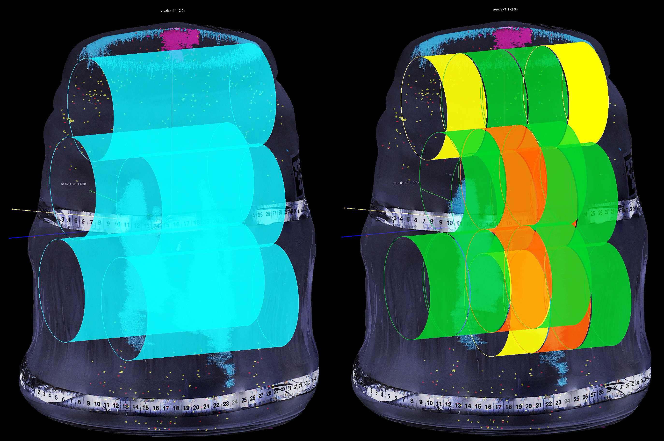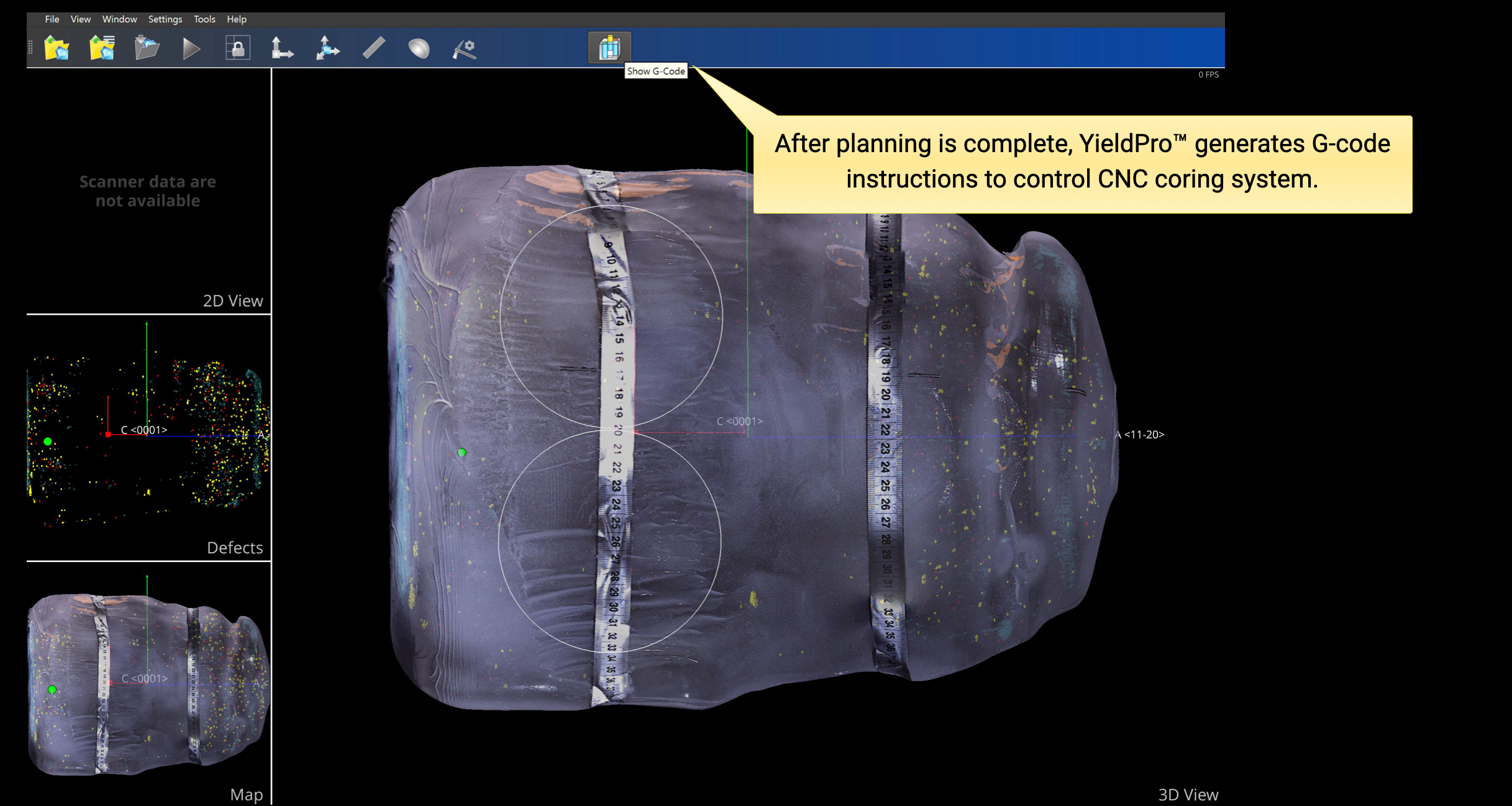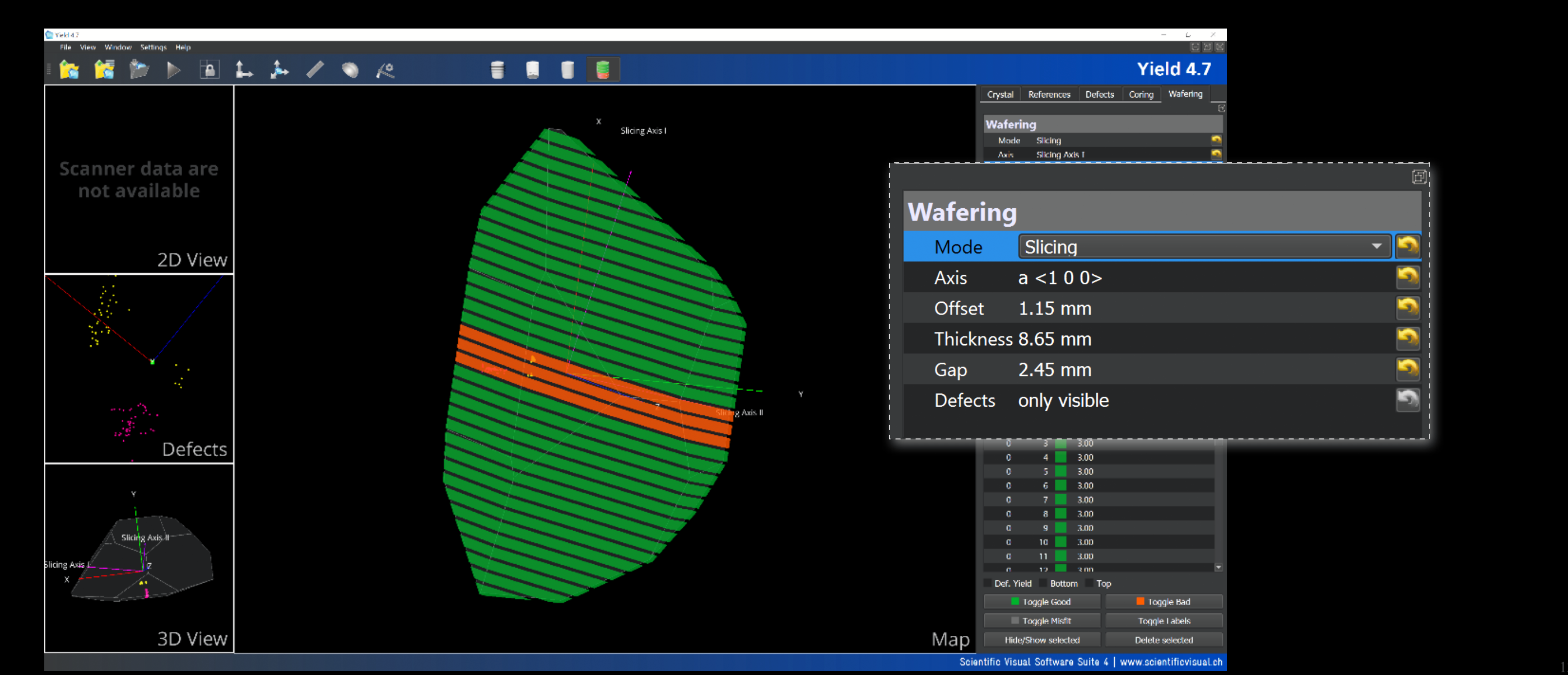 In the yield planning mode, operator places virtual cores, wafers or custom end-items inside the 3D crystal volume. YieldPro checks each proposed shape against the detected defects and estitimates the expected quality level of the resulting parts, and overall yield.