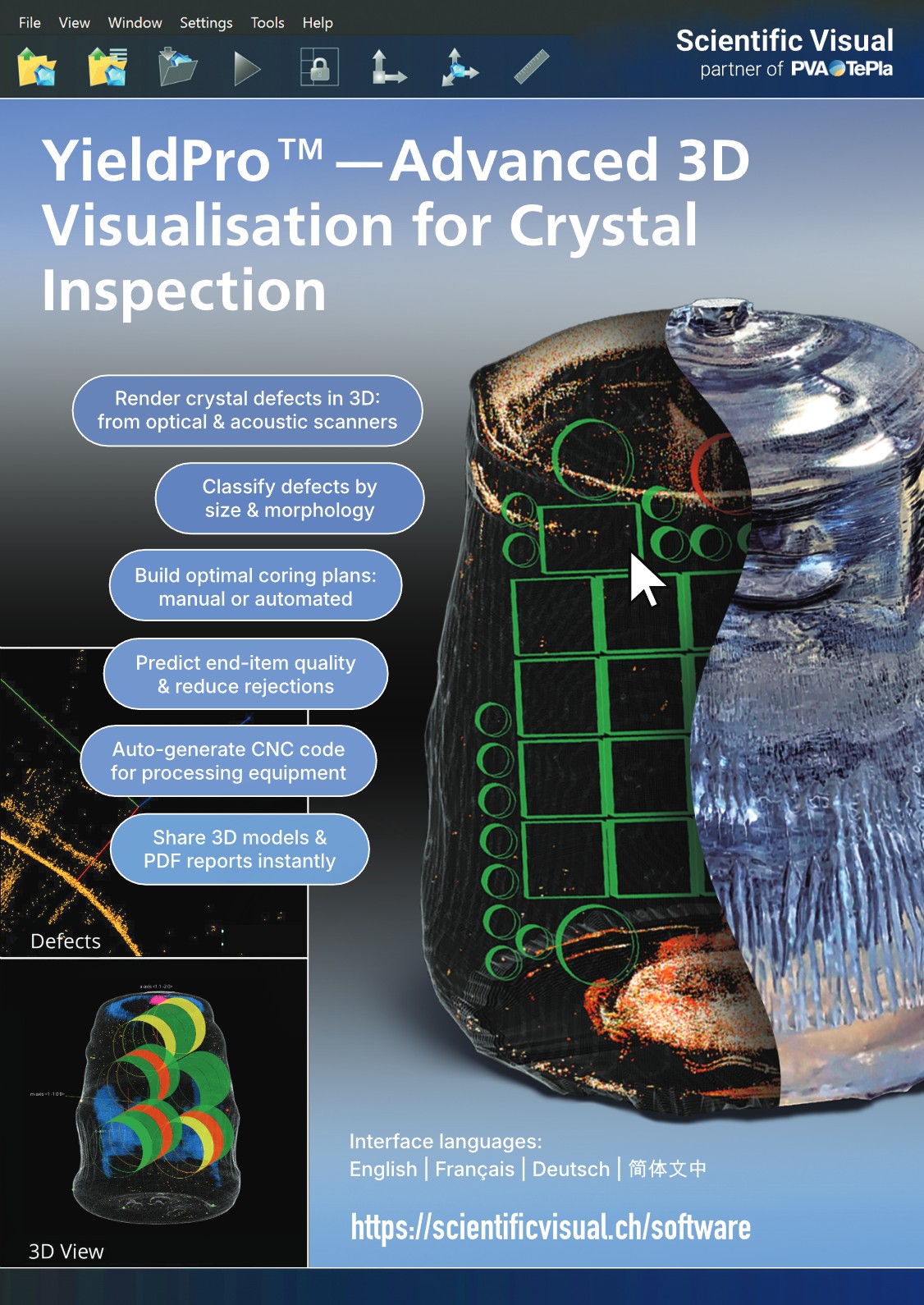 YieldPro™ Optical is a software for analysing 3D inspection data of industrial crystals. It transforms scan data into an interactive 3D model of the crystal – showing crystal geometry, internal defects, defect-free zones and stress maps in one view.